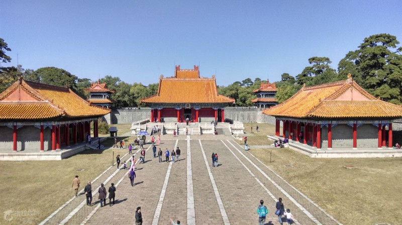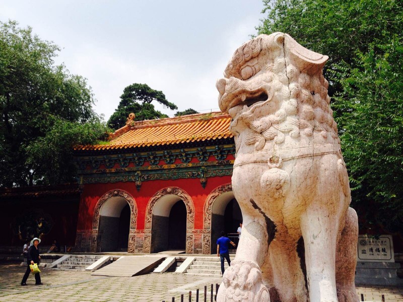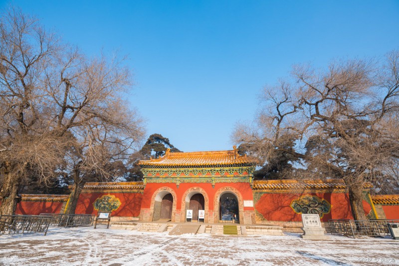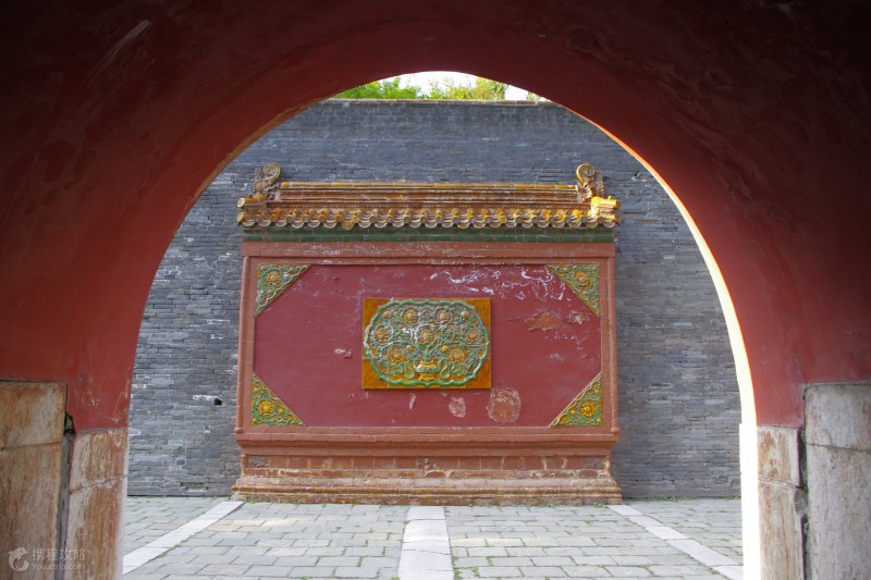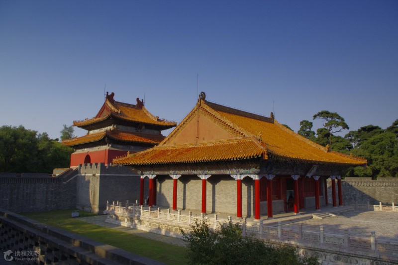 方城的北面就是月牙形的寶城,寶城前壁的正中有一座琉璃照壁。寶城的正中是寶頂,系用三合土筑成,下面的地宮埋葬著清太祖努爾哈赤和孝慈皇后葉赫那拉氏。由于整個(gè)陵墓依山勢而建,你會(huì)發(fā)現(xiàn)建筑物也隨著坡勢起伏,顯得更加錯(cuò)落有致、高大雄偉。