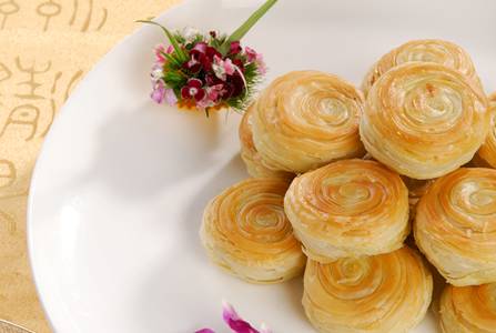 一、 千層油酥餅(榮獲“金鼎獎(jiǎng)”、“中華名小吃”稱號(hào)) 【典故】 千層油酥餅被譽(yù)為“長(zhǎng)安第一點(diǎn)”。相傳,唐玄奘法師取經(jīng)回長(zhǎng)安后,翻譯佛經(jīng)達(dá)千卷時(shí),唐高宗李治命宮中御廚專門用植物油炸成“千層烙餅”,賞賜給玄奘,以示慰勞和表彰。后經(jīng)歷代廚師不斷改進(jìn),取名為千層油酥餅。千余年來(lái)歷久不衰,一直流傳至今。